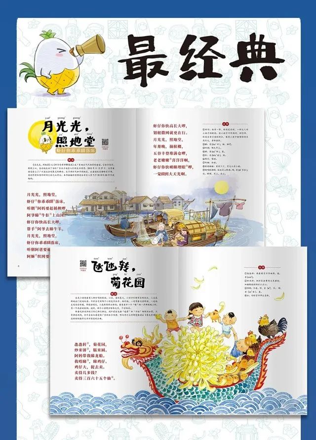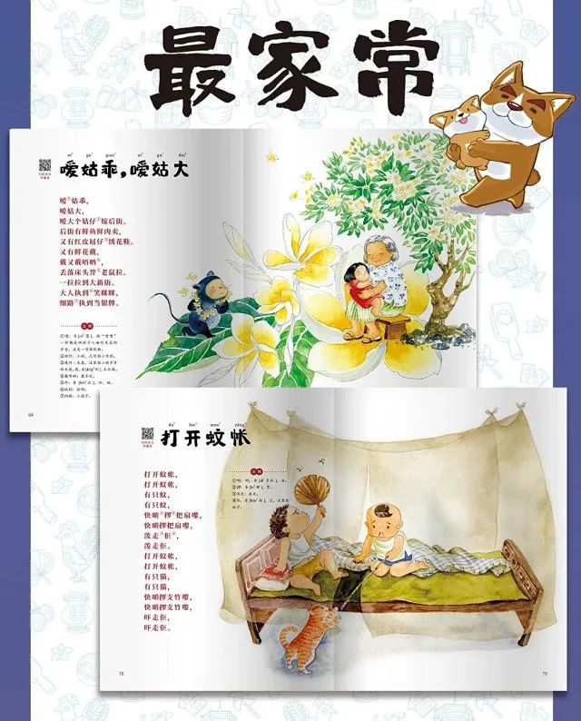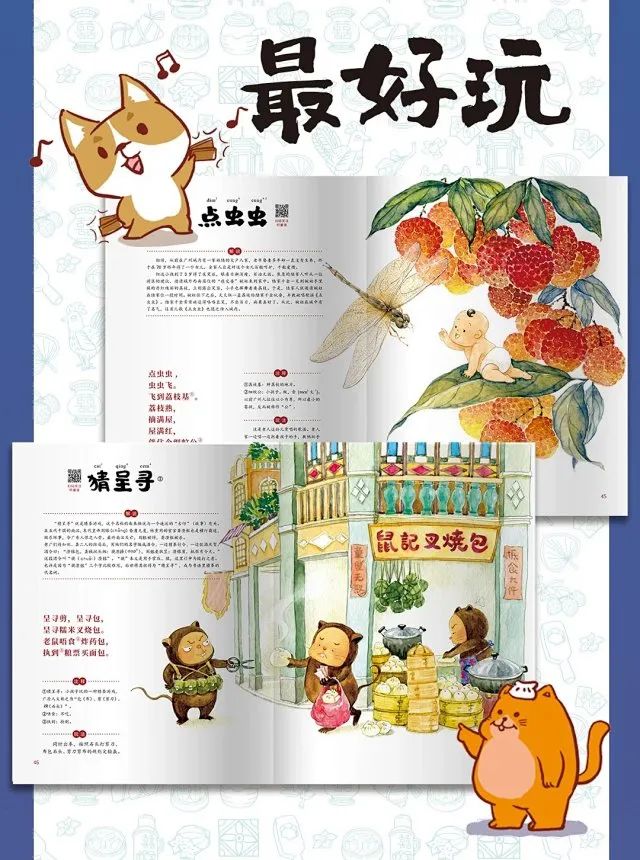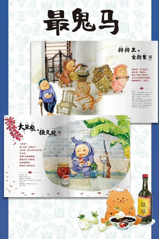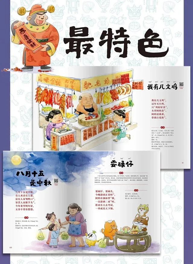 早在2014年,“大话国”主创团队就曾出版《老广新游之广府童谣》一书。这次全面升级的《大话粤语·广府童谣》增加了过去9年间积累的广府童谣,并通过“最经典”“最鬼马”“最好玩”等六个篇章进行展现。每首童谣配有手绘插画,对童谣中的风土人情、方言俚语进行文字注释解说,还补全了音频,整体风格趣致活泼又兼具知识性。