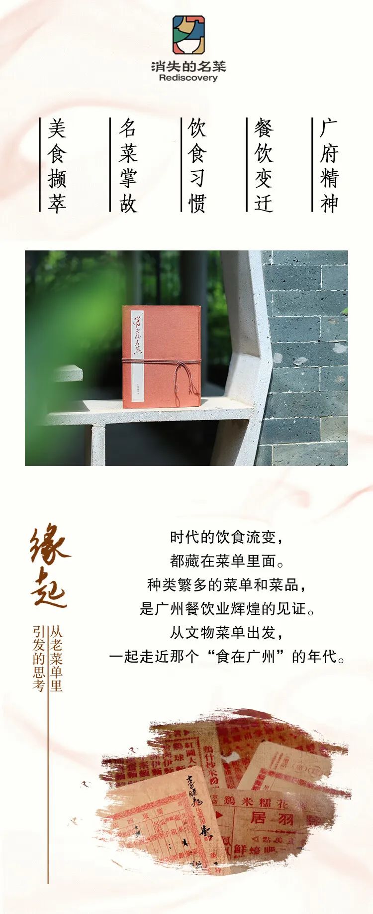 《消失的名菜》将餐桌名菜记录于纸面,从名菜中深入挖掘广州历史,传承发扬广州饮食文化,透过饮食文化的窗口,领略丰富的岭南文化与生活民俗。