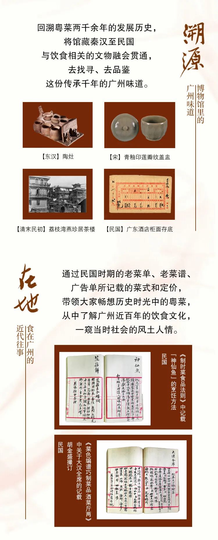 第二部分为“溯源:博物馆里的广州味道”,将馆藏秦汉至民国与饮食相关的文物融会贯通,对粤菜两千余年的发展历史作较为系统的回溯。