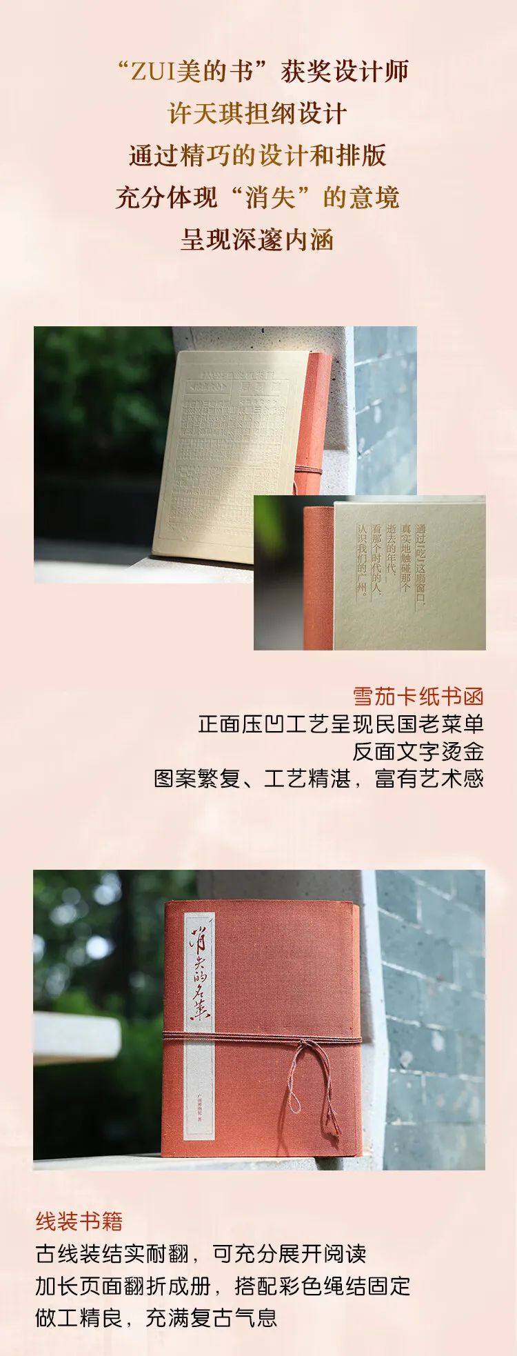 《消失的名菜》的装帧由三次获得“中国最美图书”的许天琪设计师打造,分为精装版和平装版。其中,精装版设计为线装书的样式,带书函,模拟民国的菜谱,封面采用颇有质感的江户彩织锦,烫压陆羽居菜单的纹饰;书中涉及的菜单均采用宣纸加毛笔字呈现,让人仿佛亲自触摸民国菜单,颇有身临其境之感。最值得称道的是“二京果”“五柳石斑”“仙翁奶露”三个菜式的图片运用了感香油墨,让读者不但可以阅读文字,还可以闻到淡淡的不同食物之味,显示出设计的匠心所在。