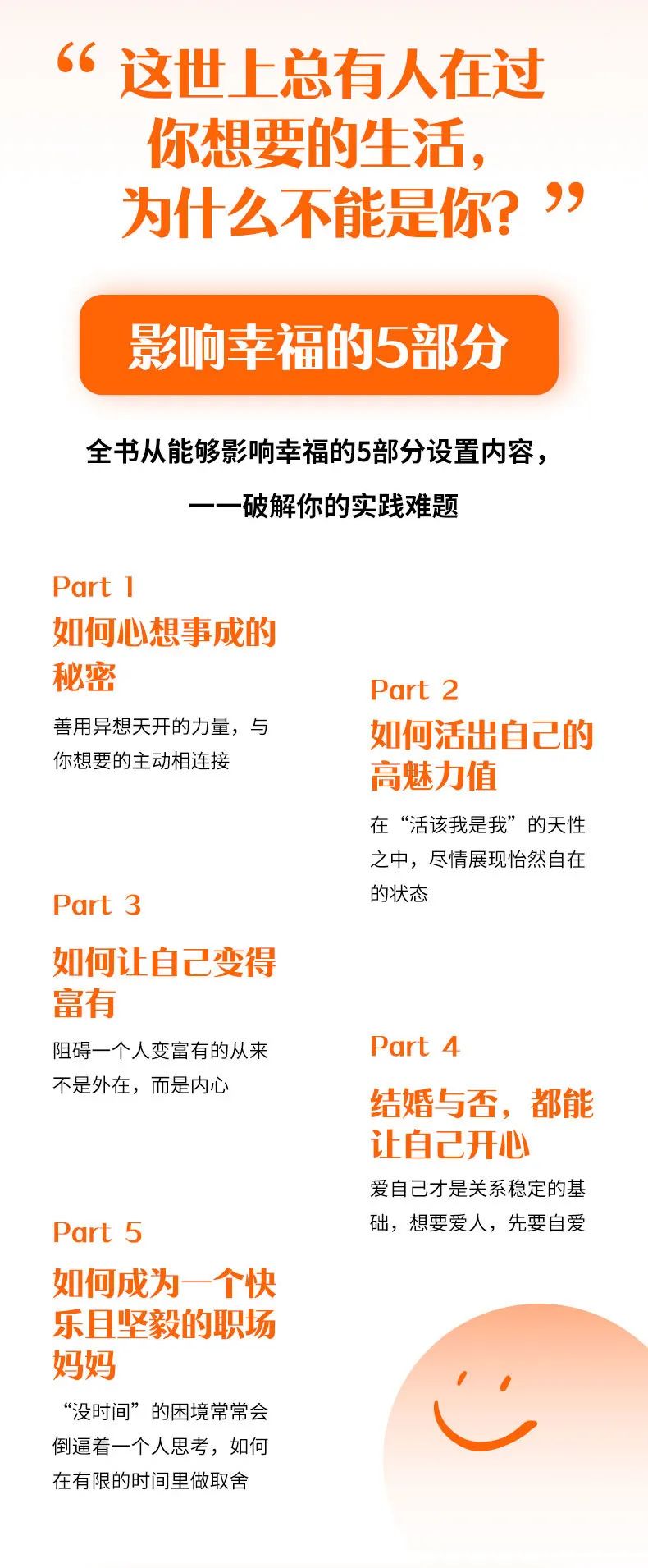 她把自己的经验总结成书,给出了最适用于普通人的幸福方法论。《你也可以活成想要的幸福模样》一书,共分为五个部分,详细阐述了可以活得幸福的五大方面:心想事成的秘密、活出自己的高魅力值、让自己变得富有、爱自己才是关系稳定的基础以及如何成为一个快乐且坚毅的妈妈。书中金句不断,读来颇有醍醐灌顶之感。