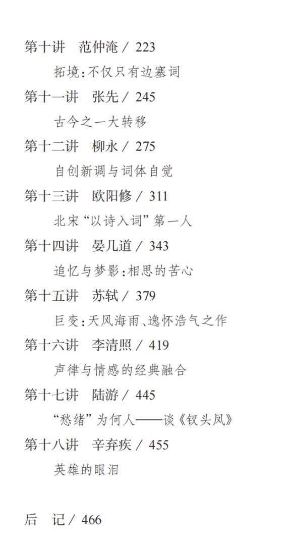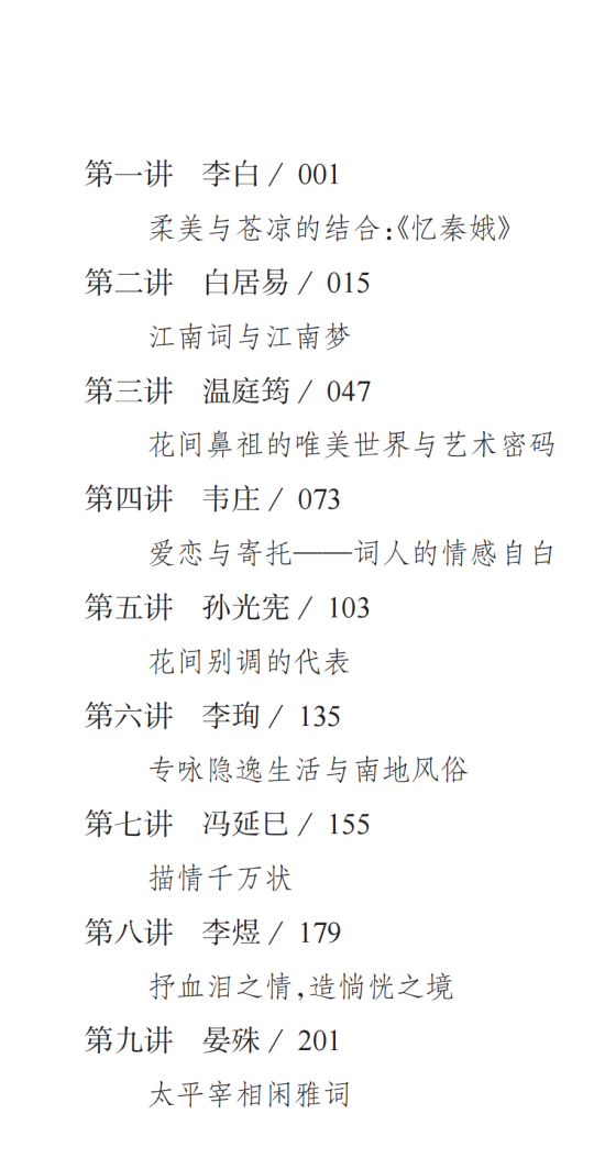 作者不仅解读词人的生平事迹和代表作品,还详细分析他们的创作风格和艺术特色。例如,我们可以从中获知,花间鼻祖温庭筠的唯美世界和艺术密码,南唐后主李煜的血泪之情和惝恍之境,“奉旨填词柳三变”柳永的自创新调和词体自觉等。