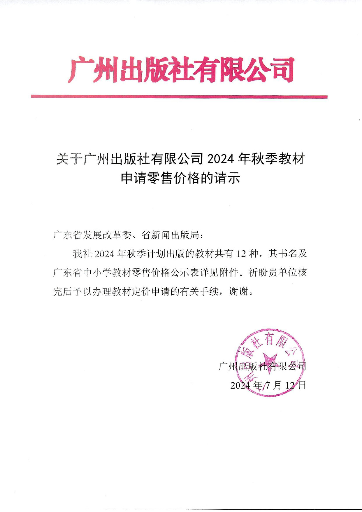 关于乐鱼足球体育有限公司2024年秋季教材申请零售价格的请示