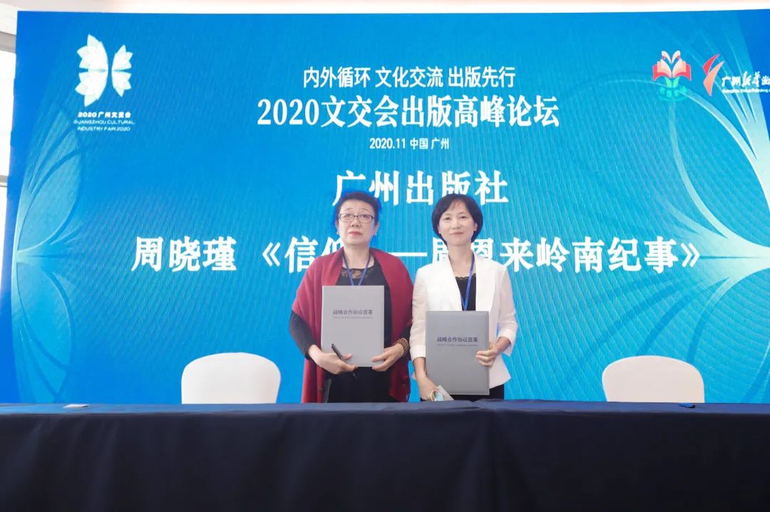乐鱼足球体育有限公司董事长柳宗慧(右)与《信仰——周恩来岭南纪事》作者、广东红色文化研究会副会长、周恩来总理侄孙女周晓瑾(左)签约